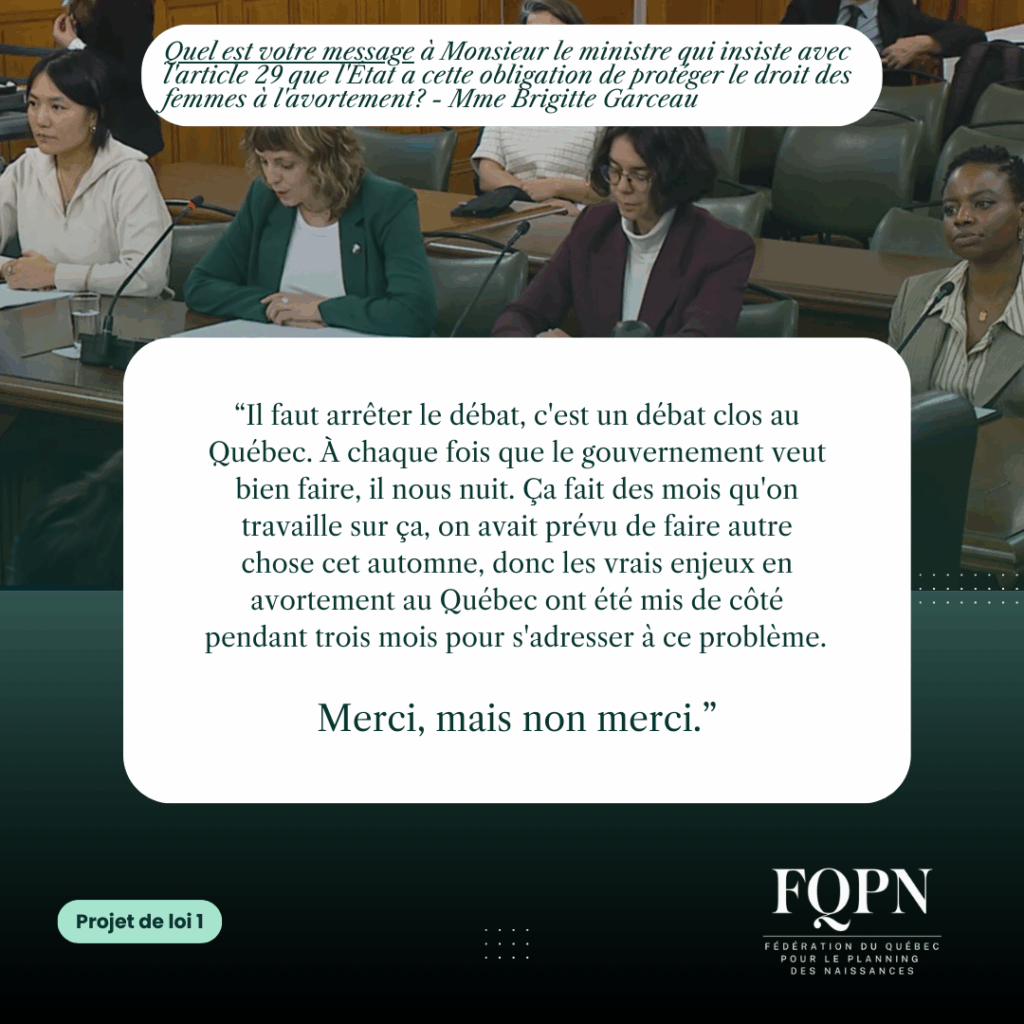 Le 11 décembre 2025, l’équipe de la FQPN a présenté la position claire et consensuelle du mouvement pro-choix à la commission des institutions: légiférer c’est fragiliser le droit à l’avortement. Pour visualiser la vidéo de la présentation, visitez https://www.assnat.qc.ca/fr/video-audio/archives-parlementaires/travaux-commissions/AudioVideo-111519.html